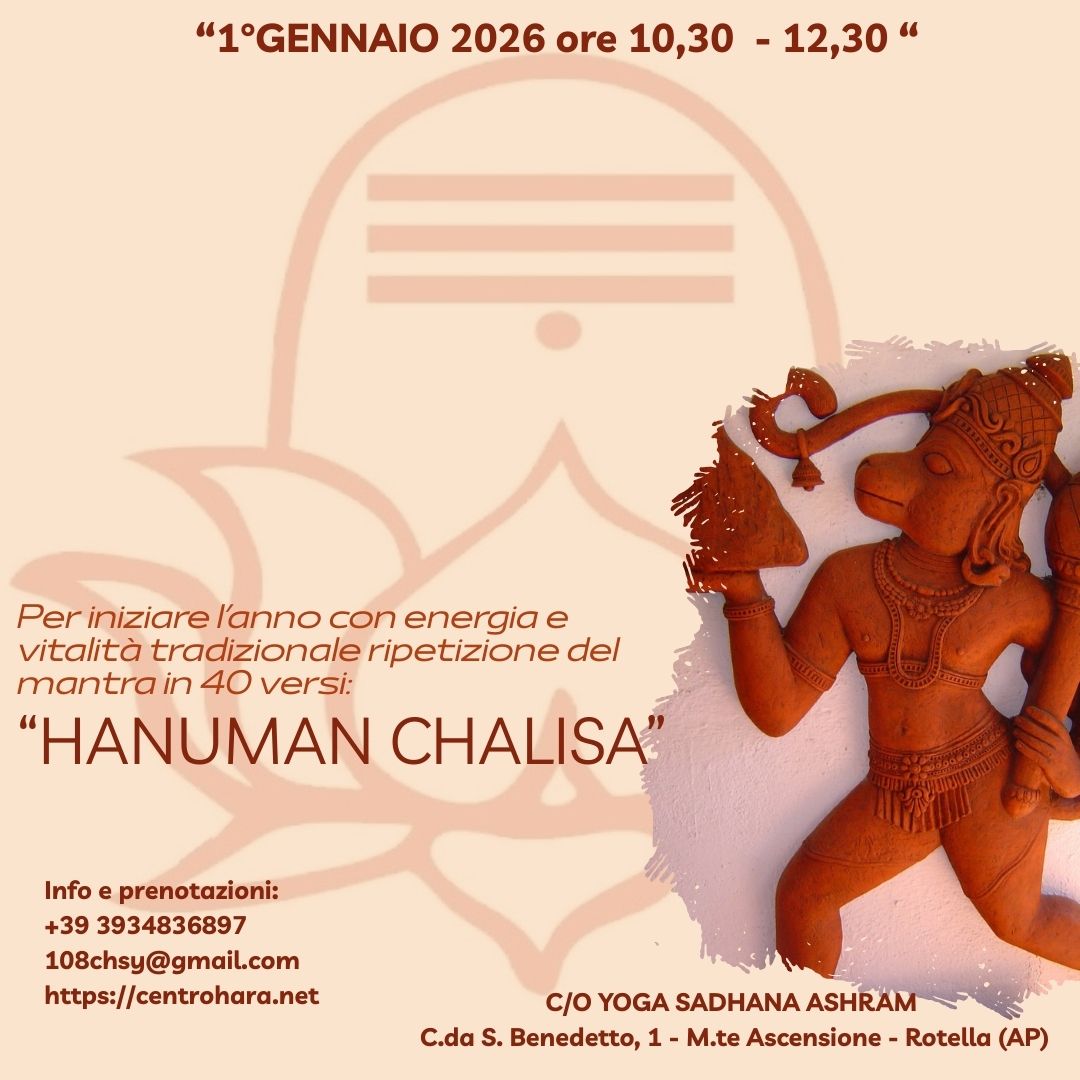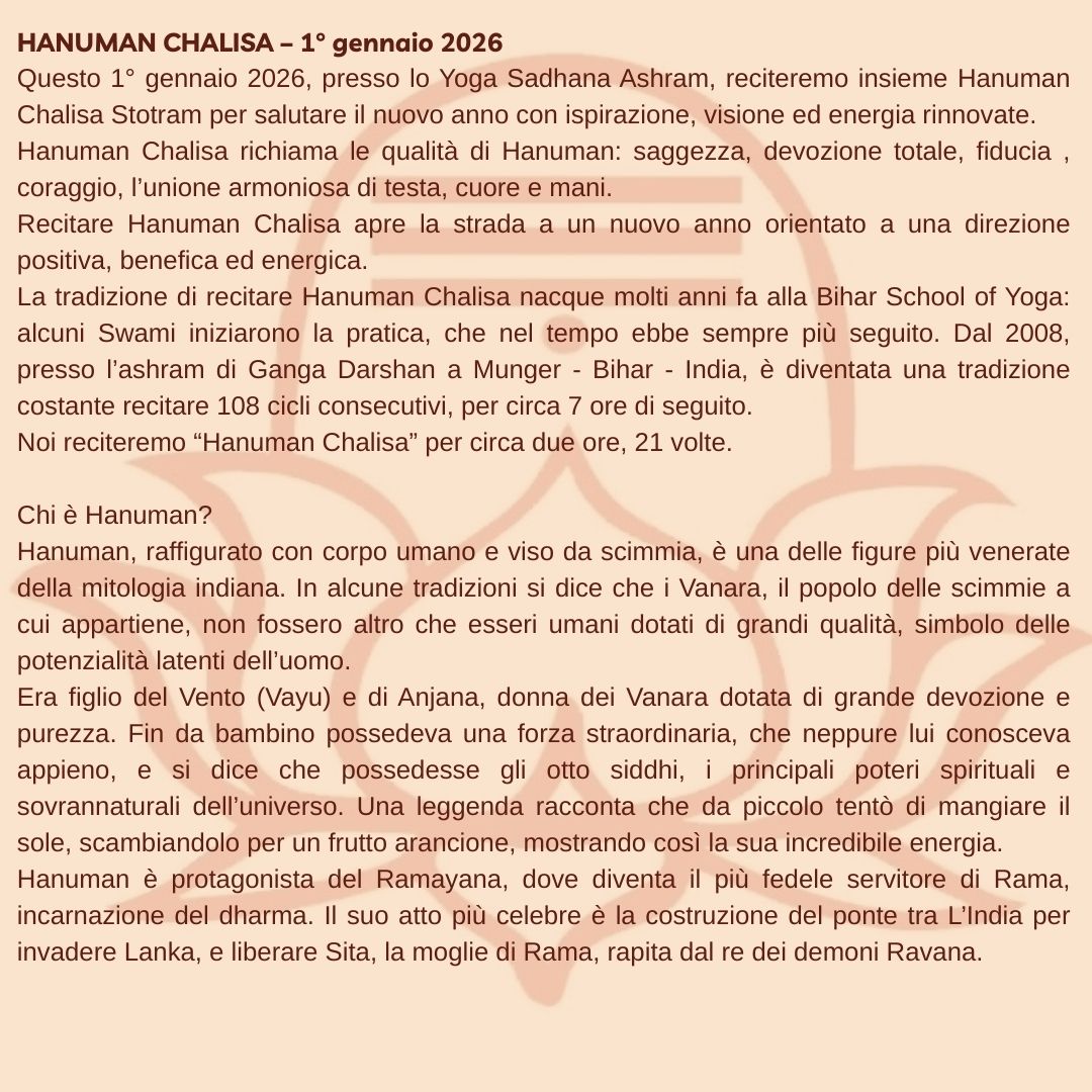 Siamo lieti di invitarvi al programma di ripetizione dei 40 versi di Hanuman Chalisa, giovedì 01 Gennaio 2026 per iniziare il nuovo anno con energia e gioia.